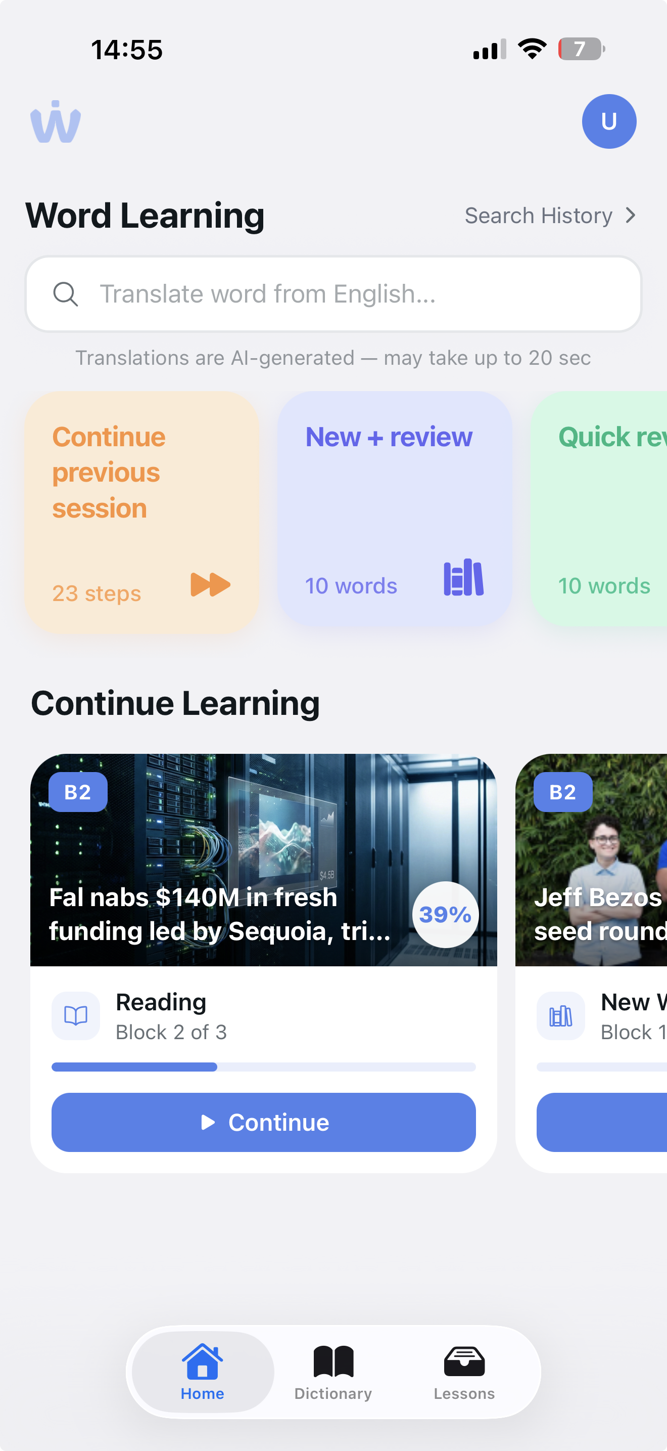 Master English vocabulary through real-world content about AI, cinema, technology, sports, and more. Not boring textbooks — engaging topics that matter to you.